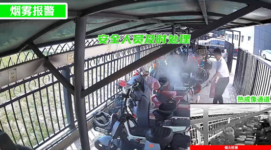 方案支持部署热成像火点识别摄像机,可对停放区域进行全天候实时监测,精准捕捉温度异常、冒烟起火等火灾前兆。一旦触发报警阈值,系统将立即启动三重预警:现场响起语音播报、闪烁白光警示,并联动报警器发出警报;监控平台端的电子地图快速定位报警点位,同时弹窗显示现场实时视频,方便工作人员第一时间掌握情况;管理人员的移动 APP 也会同步推送报警信息,确保通知无死角。不仅如此,工作人员还可通过远程操作,即时启动干粉灭火装置或水喷淋系统,以秒级响应速度快速控制火情蔓延,将火灾损失降至最低。